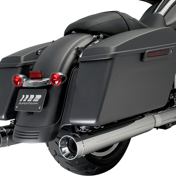 Caracteristicas: Massive 4" non-tunable bodies Streamlined, internal tapered, billet aluminum end caps with recessed fasteners are preinstalled Inlets shaped for better flow into OEM headpipe as well as SuperTrapp True Dual Headpipes Provide a bold, strong power curve from mid-range on up with a significant horsepower and torque gain over stock mufflers Classic deep and heavy Kerker rumble is 5 dB over stock Made in the U.S.A.