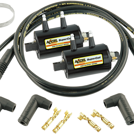Caracteristicas: High-output coils for use in 2 cylinder motorcycles ACCEL engineers designed these coils' special low-resistance primary winding to match the operating characteristics of factory and aftermarket CDI systems Maximum performance with fast rise times Extra-heavy-duty 8.8mm silicone wires included Made in the U.S.A. Using the wrong coil may damage your motorcycle's electronic ignition module. To determine your ignition type, complete the following test: 1. Determine whether the type of coil you are replacing is a high tower coil. (These coils will NOT replace single tower coils.)2. Using a volt meter or 12V test light, hook the positive lead to the positive post and the negative lead to the ground on one of the stock coils.3. Turn the ignition on, but DO NOT engage the starter button.4. If there are 12V at the coil, the motorcycle has an inductive type ignition. If there is no voltage at the coil, then the motorcycle has a CDI ignition because the power goes to the control box first.