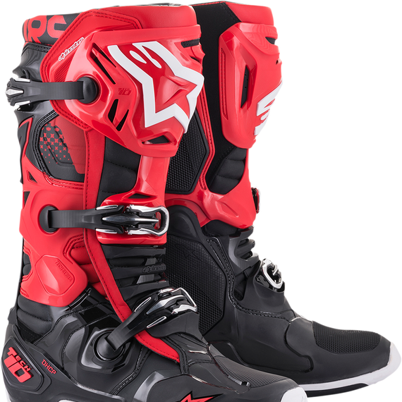 Caracteristicas: The most significant upgrades to the Tech 10 performance are unique technologies: The Frontal Flexion Control Frame, the Asymmetrical Dual-pivot Arms, the patented Dynamic Heel Compression Protection Shock Absorber which is integrated into a redesigned foot shell and the slimmer, more streamlined, outsole. New material composites have been created that are lighter in weight and more durable to ensure they hold up to the rigors of off-road riding. The new, cold-forged, aluminum buckles are a result with an easier to operate, more durable and self-aligning closure that offer a positive hold across the upper surfaces of the boot. The result has yielded over 400 grams (almost 1lb) in weight reduction for the new Tech 10. The design also reduces the Tech 10’s profile and physical size. It is more streamlined with newer, lighter, more durable composite materials and a more integrated approach to the construction of the components which dynamically enhance the chassis of the boot and utilize more advanced bonding processes. Asymmetrical medial and lateral double pivot system for improved levels of flexibility and precision for both independent and synchronized movement Constructed from a dual density compound and combined with the rear blade system Double pivot system allows the Tech 10 to retain its integrity while flexing Energy dissipating shin plate features a new anatomic design for reduced surface area and weight-saving Exclusive dual-compound sole is seamlessly integrated to the multi-density foot base structure with built-in support Foot shell features five different compounds in a single lightweight piece to offer strength while maintaining flexibility and structural integrity Innovative flexion inserts work seamlessly with new flex support system for ultimate in performance Low-profile, pull-on design for reduce material build, less weight and to facilitate easier and quicker wearing Poly-fabric lining with 3D open cell foam incorporates anti-slip suede in heel area, keeping the foot located inside the boot Provides a complete and seamless flexion control system, from the foot shell all the way up to the shin plate Redesigned dual density Thermoplastic Polyurethane (TPU) rear blade system engineered to prevent hyper-extension while offering improved flex control and impact resistance TPU protection and shock absorbing padding on the heel and ankles Ankle control system developed in the outer shell construction, allowing natural ankle movement, vertical compression control and improved impact protection Asymmetrical, dual pivot arms on boot frame Chassis combines advanced lightweight microfiber and impact and abrasion resistant TPU shell Closure system features contra-closure, doubling closure security and a quick release/locking system with self-aligning, memory, design for easy, precise closure and improved riding performance and security Combines dual front and rear blade connectors Completely redesigned sole with proprietary grip sculpturing to improve foot-peg performance, grip and mud and water run-off Contoured TPU calf protector plate offers impact resistance Dynamic Heel Compression Protector (DHCP), an innovative safety feature which includes a fully integrated collapsible heel area with expanded poly-foam to absorb high impact energies during a crash Engineered to 'float' freely between the lower and upper boot construction Patented technology features lighter, anatomically redesigned medial and lateral torsion arms Slim-line buckles include high-impact bridge closures which are cold forged for precision and strength Soft microfiber gaiter helps seal out excessive water and dirt entry Soles and buckles are easily replaceable