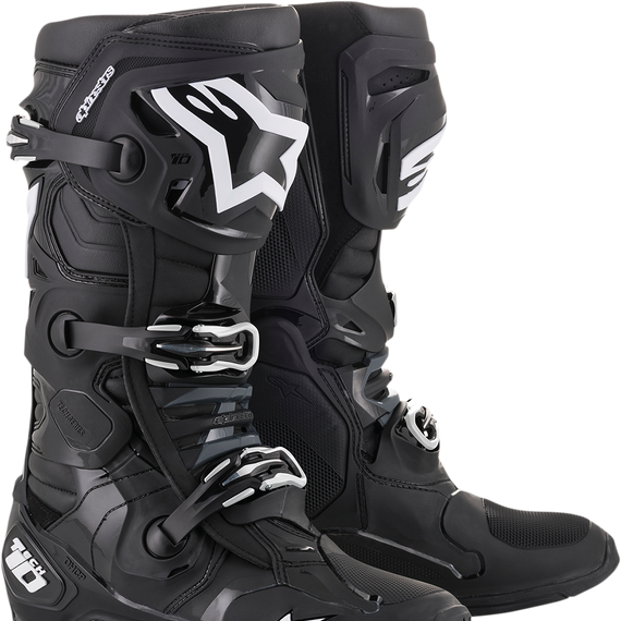 Caracteristicas: The most significant upgrades to the Tech 10 performance are unique technologies: The Frontal Flexion Control Frame, the Asymmetrical Dual-pivot Arms, the patented Dynamic Heel Compression Protection Shock Absorber which is integrated into a redesigned foot shell and the slimmer, more streamlined, outsole. New material composites have been created that are lighter in weight and more durable to ensure they hold up to the rigors of off-road riding. The new, cold-forged, aluminum buckles are a result with an easier to operate, more durable and self-aligning closure that offer a positive hold across the upper surfaces of the boot. The result has yielded over 400 grams (almost 1lb) in weight reduction for the new Tech 10. The design also reduces the Tech 10’s profile and physical size. It is more streamlined with newer, lighter, more durable composite materials and a more integrated approach to the construction of the components which dynamically enhance the chassis of the boot and utilize more advanced bonding processes. Asymmetrical medial and lateral double pivot system for improved levels of flexibility and precision for both independent and synchronized movement Constructed from a dual density compound and combined with the rear blade system Double pivot system allows the Tech 10 to retain its integrity while flexing Energy dissipating shin plate features a new anatomic design for reduced surface area and weight-saving Exclusive dual-compound sole is seamlessly integrated to the multi-density foot base structure with built-in support Foot shell features five different compounds in a single lightweight piece to offer strength while maintaining flexibility and structural integrity Innovative flexion inserts work seamlessly with new flex support system for ultimate in performance Low-profile, pull-on design for reduce material build, less weight and to facilitate easier and quicker wearing Poly-fabric lining with 3D open cell foam incorporates anti-slip suede in heel area, keeping the foot located inside the boot Provides a complete and seamless flexion control system, from the foot shell all the way up to the shin plate Redesigned dual density Thermoplastic Polyurethane (TPU) rear blade system engineered to prevent hyper-extension while offering improved flex control and impact resistance TPU protection and shock absorbing padding on the heel and ankles Ankle control system developed in the outer shell construction, allowing natural ankle movement, vertical compression control and improved impact protection Asymmetrical, dual pivot arms on boot frame Chassis combines advanced lightweight microfiber and impact and abrasion resistant TPU shell Closure system features contra-closure, doubling closure security and a quick release/locking system with self-aligning, memory, design for easy, precise closure and improved riding performance and security Combines dual front and rear blade connectors Completely redesigned sole with proprietary grip sculpturing to improve foot-peg performance, grip and mud and water run-off Contoured TPU calf protector plate offers impact resistance Dynamic Heel Compression Protector (DHCP), an innovative safety feature which includes a fully integrated collapsible heel area with expanded poly-foam to absorb high impact energies during a crash Engineered to 'float' freely between the lower and upper boot construction Patented technology features lighter, anatomically redesigned medial and lateral torsion arms Slim-line buckles include high-impact bridge closures which are cold forged for precision and strength Soft microfiber gaiter helps seal out excessive water and dirt entry Soles and buckles are easily replaceable
