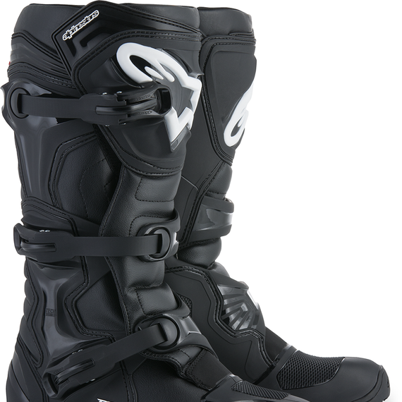 Caracteristicas: Boot upper construction is an innovative, lightweight microfiber material that is flexible and abrasion-resistant Light microfiber on front and rear bellows provides a more comfortable flex area Toe box is made of synthetic material for high abrasion resistance Extended Polyurethane (PU) synthetic gaiter helps seal out water and dirt Contoured Thermoplastic Polyurethane (TPU) calf guard, TPU higher medial guard, TPU outer lateral ankle guard and TPU heel counter for support and resistance to impacts Rear TPU gaiter patch applied on the top of the TPU calf protector for comfort and impact resistance on the rear flex area Injected TPU shin plate is connected with the TPU medial guard panel Hook-and-loop upper boot closure with TR flap that provides a wide range of fit and support TPU higher medial protector designed with technical texturing for improved grip Biomechanical medial blade system allows good front/rear boot flex and added support and impact resistance for the ankle Ergonomic TPU triple buckle straps wrap smoothly from the front flex and medial guard to the lateral side of the boot without compromising the boot's flexibility Closure system uses three polymer buckles with ratchet closure, buckle memory system and quick release/locking system with a self-aligning design All boot buckles are replaceable One-piece TPU injected dual-compound foot shell is reinforced by a metal shank inside a co-injected toe reinforcement Soft foam surrounds the ankles and boot collar for comfort and shock-absorbing performance Entire boot is textile lined for comfort Replaceable EVA footbed with textile top lining Alpinestars all-terrain sole design with high-grip rubber compounds; sole is replaceable