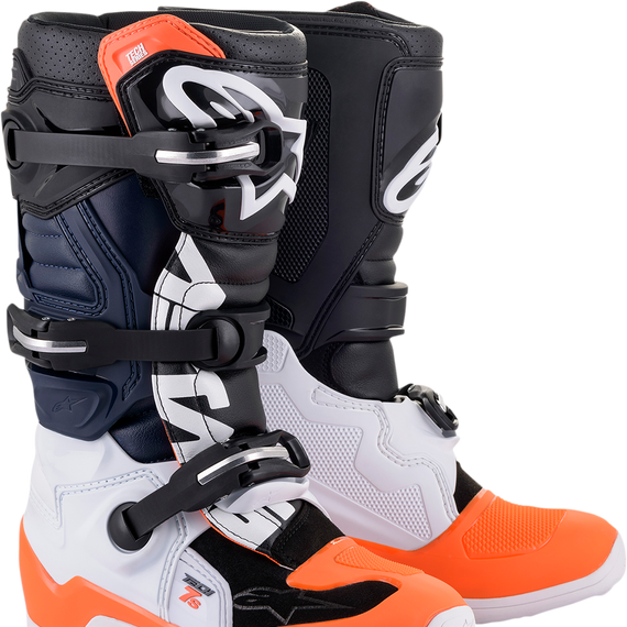 Caracteristicas: Specifically designed and sized for junior and/or smaller framed riders Polyurethane (PU)-reinforced microfiber upper for flexibility, abrasion-resistance, water-resistance and weight-saving Material ensures consistent fit and is easy to maintain and clean Contoured shin plate is injected with high-modulus Thermoplastic Polyurethane (TPU) for excellent levels of impact- and abrasion-resistance Medial facing side incorporates TPU panel with specially designed sculpturing for maximum grip contact with bike and improved heat- and abrasion-resistance One-piece injected dual compound foot shell with co-injected hard toe protector and integrated steel shank Shell is highly resistant to abrasion and impact, adds to the boot’s overall durability and improves boot’s streamlining Excellent flexion provided by low-profile medial and lateral pivot system to offer movement and support Instep and Achilles accordion flex zones constructed for superior control and support Extended microfiber gaiter helps seal out excessive water and dirt entry Compound sole is seamlessly integrated into the base structure for superior durability, high-performing rubber grip patterning, and feel Sole is replaceable Soft poly foam reinforcement on ankles and collar for long-lasting comfort and shock absorption Removable anatomic footbed for comfort and support ensures even weight distribution 3D mesh textile with open cell foam for improved air circulation and comfort Buckle closure system incorporates polymer and fiberglass buckle arms and high-impact aluminum bridge closures for durability and weight-saving Buckle system features memory and a quick release/locking system with self-aligning design for easy, precise closure and improved riding performance and security All buckles are easily replaceable
