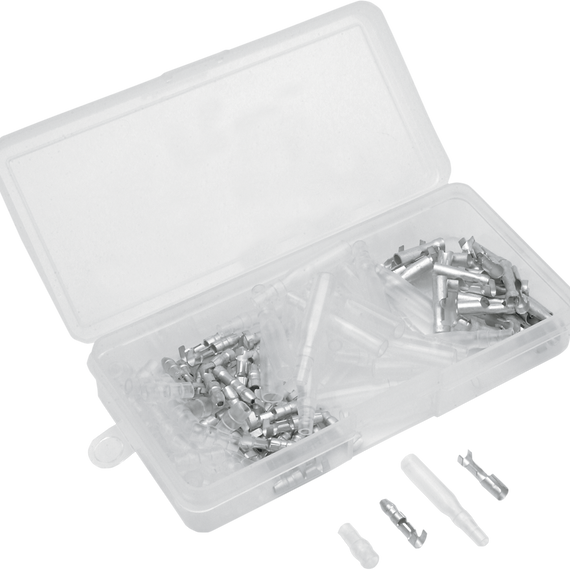 Caracteristicas: Includes 30 each of male/female terminals and plastic sleeves Terminals are tin plated; includes plastic case Set of five dual female terminals and 10 male terminals all with plastic sleeves Female are rust-proof; males are tin plated