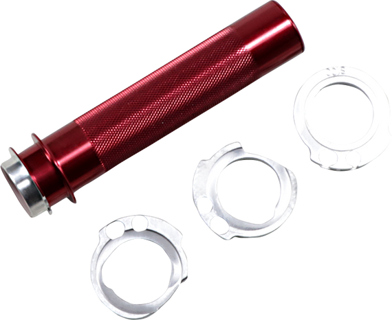 Caracteristicas: Give the rider better control, no matter what the ground condition Throttle cam system alters the ratio between hand-throttle rotation and opening of the carburetor, which improves the rider's control over the bike where it matters most, in the turns System includes a 6061 billet aluminum throttle tube with a knurled surface and three cams Delrin bushings in both ends of the tube eliminate all aluminum-to-aluminum contact to give the feeling of a ball-bearing tube without rust or freeze-up Each included cam is designed with track conditions in mind; one for perfect, one for intermediate and one for slippery or highly technical conditions One cam is stock diameter, the other two have different ramped shapes, which means the rider will turn their hand slightly farther to open the carburetor while in the zero to half-throttle range; the ramped shape ensures full throttle within a quarter turn Changing cams is easily achieved in less than a minute Throttle tube has removable end cap to allow installation of handguard