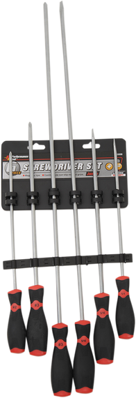 Caracteristicas: Great for tough-to-get-to applications Comfortable non-slip molded grips with chrome vanadium steel shanks and magnetic tips Six-piece set includes 5/16" x 24" slotted, 5/16" x 12" slotted, 1/4" x 10" slotted, #3 x 24" Phillips, #3 x 12" Phillips and #2 x 10" Phillips