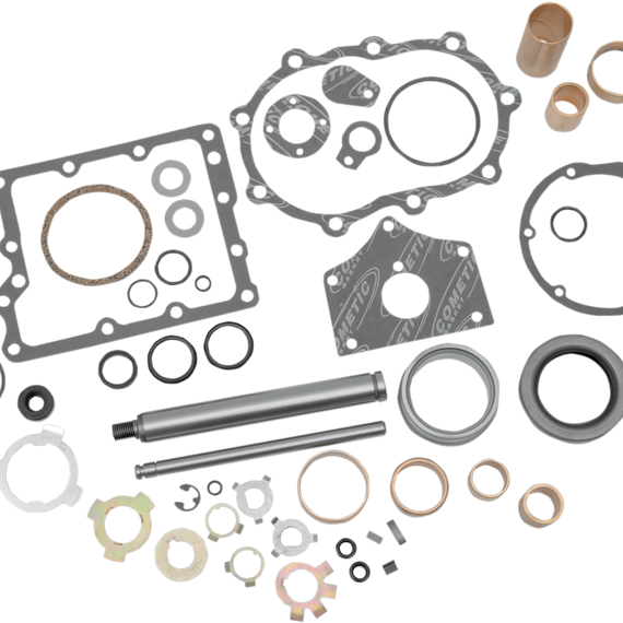Caracteristicas: Features JIMS transmission parts and gasket set Includes standard size race, snap rings, clips, shift shaft, countershaft, seals and bushings; everything except bearings Made in the U.S.A.