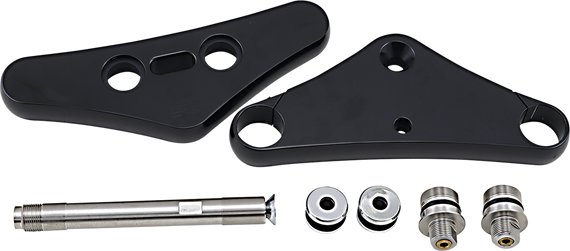 Caracteristicas: CNC-machined from aircraft-quality billet aluminum Includes fork tube plugs that allow for a clean, finished look on the top of the triple tree Triple trees are pre-drilled to mount the Pro-One Hide Away internal fork stop kits Includes handlebar dampers with chrome billet caps, a fork stem, and all the necessary mounting hardware Accepts 41 mm fork tubes Raked triple trees change handling characteristics of motorcycle. Steering geometry must be calculated to determine which degree of rake is most suited for application. Trees with more than 3° of rake should not be used in stock frame applications.