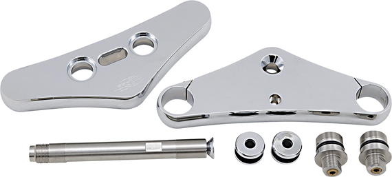 Caracteristicas: CNC-machined from aircraft-quality billet aluminum Includes fork tube plugs that allow for a clean, finished look on the top of the triple tree Triple trees are pre-drilled to mount the Pro-One Hide Away internal fork stop kits Includes handlebar dampers with chrome billet caps, a fork stem, and all the necessary mounting hardware Accepts 41 mm fork tubes Raked triple trees change handling characteristics of motorcycle. Steering geometry must be calculated to determine which degree of rake is most suited for application. Trees with more than 3° of rake should not be used in stock frame applications.