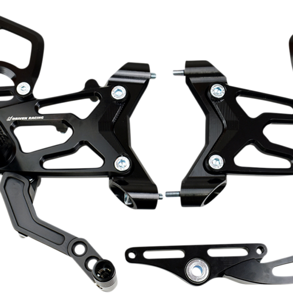 Caracteristicas: Race-inspired design All rearsets feature high-grade hardware, folding shift/brake pegs and standard or reverse shift pattern options Footpeg plate has a small window that shows peg adjustment value and conceals all mounting holes not in use Anodized black finish
