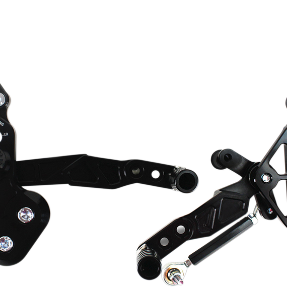 Caracteristicas: Race-inspired design All rearsets feature high-grade hardware, folding shift/brake pegs and standard or reverse shift pattern options Footpeg plate has a small window that shows peg adjustment value and conceals all mounting holes not in use Anodized black finish