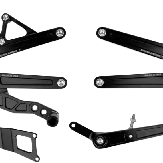 Caracteristicas: Race-inspired design All rearsets feature high-grade hardware, folding shift/brake pegs and standard or reverse shift pattern options Footpeg plate has a small window that shows peg adjustment value and conceals all mounting holes not in use Anodized black finish