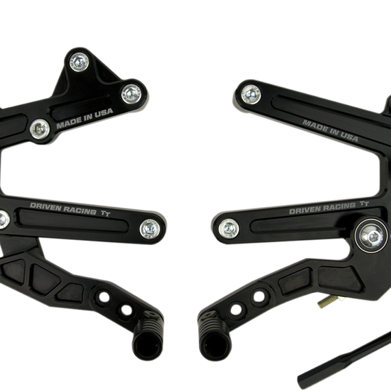 Caracteristicas: Race-inspired design All rearsets feature high-grade hardware, folding shift/brake pegs and standard or reverse shift pattern options Footpeg plate has a small window that shows peg adjustment value and conceals all mounting holes not in use Anodized black finish