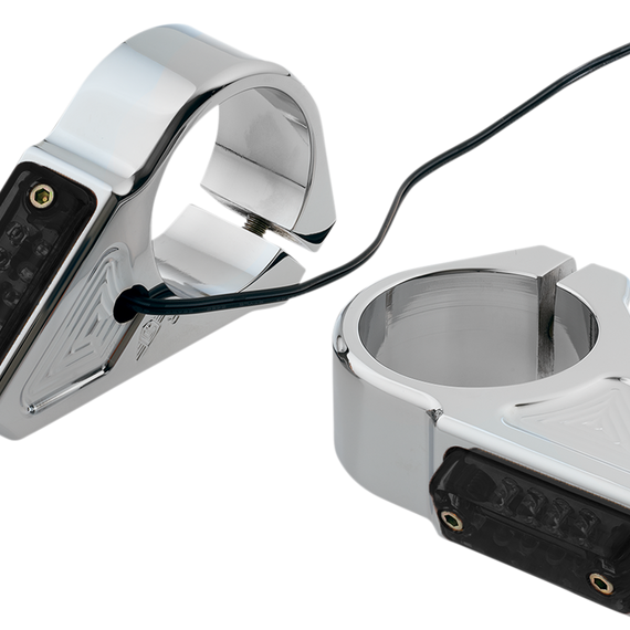 Caracteristicas: CNC machined from solid blocks of T6-6061 billet aluminum Pitch bolt mounting design for a clean look Can be mounted either inward or outward of the fork tubes Super bright amber LED lights; 1-1/2" wide, 1/2" tall Lights are set a 25 degree angle for standard HD forks Made in the USA