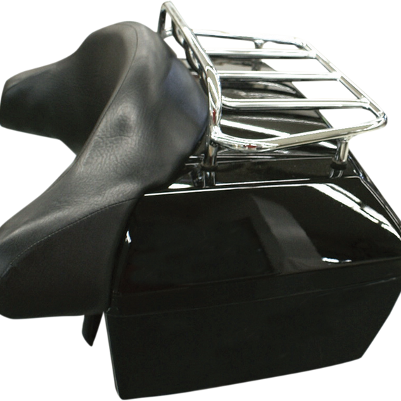 Caracteristicas: Weather-protecting trunk made of ABS plastic with gloss black finish Comes with a molded and upholstered backrest and functional chrome steel luggage Holds two full-size helmets Fits on most luggage racks measuring 8" x 8" or larger Includes bottom support rack and mounting hardware Measures 12" H x 15" W x 20" L