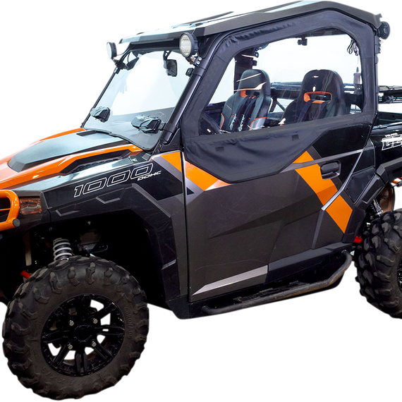 Caracteristicas: Integrates with factory half doors to create a sealed cab (with addition of a back panel and windshield, sold separately) 3/4” steel frame Durable UV protected nylon canvas Crystal-clear vinyl zippered window Integrated storage for window when open Built-in mounting tab for mirrors (available separately)