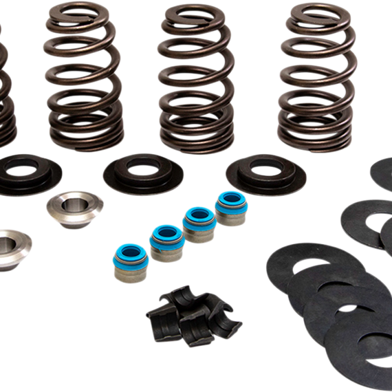 Caracteristicas: Made from premium stress-relieved conical ovate wire Feature extremely high-level of fatigue life Use a much smaller and lighter weight retainer to reduce valve weight and create quicker rev and smoother motion Designed to handle the demands of performance engines with 585" and smaller lift camshafts Kits include: Econo BeeHive® valve springs, lightweight 7° steel retainers, machined heat-treated chromoly spring seats, seat shims, valve locks and a set of premium Viton® valve seals equipped with spring-loaded valve stem wiper system Seat lbs./installed height; 183 lbs. at 1.770" (0.510" lift), 175 lbs. at 1.795" (0.535" lift), 172 lbs. at 1.813" (0.553" lift), 165 lbs. at 1.835" (0.574" lift), 160 lbs. at 1.845" (0.585" lift), 380 lbs. at 1.260" OPEN HEIGHT coil bind at 1.190" Dyno proven and track tested Feuling® BeeHive® valve springs must be installed at the correct OPEN HEIGHT, matching max lift to the open height spec of the valve springs Made in the U.S.A. Econo BeeHive® kits are direct replacement with no machining or rocker box clearance required for cams up to .574" lift for 84-04 Big Twin and 86-03 XL and up to .585" lift for 05-17 Twin Cam.