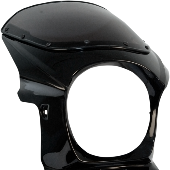 Caracteristicas: Gloss black headlight fairing with dark tinted windshield provides a racer feel Easily installs on side mount 7" headlights using provided mounting holes