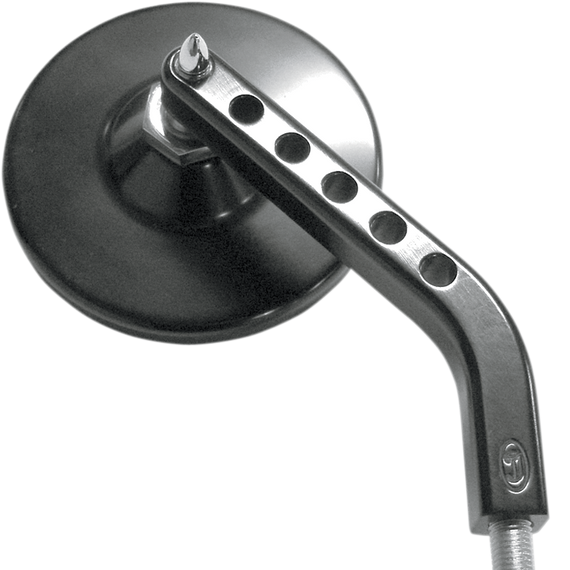 Caracteristicas: Fully adjustable 3-1/4" diameter mirror heads have ultra-exceptional rear visibility due to the use of custom-made convex mirror glass Retro style "holes" along the stem for lightness Completely CNC machined from billet aluminum (not cast), lightweight, and strong Swivel mirror head assembly is completely serviceable and is machined from a stainless-steel alloy ball that rides in a special polymer base to ensure super smooth action and corrosion free operation Direct bolt-on fit for 1984 - 2020 Harley hand controls (including V-Rod) and most aftermarket hand controls Mounting hardware is included Made in the U.S.A.