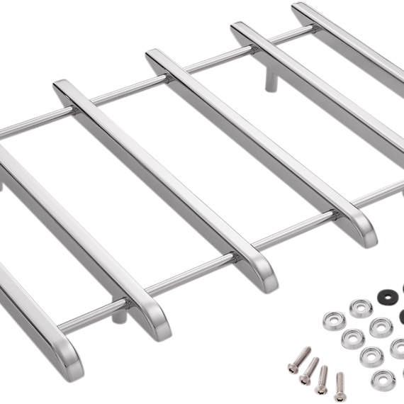 Caracteristicas: CNC machined from extruded billet aluminum Custom extruded aluminum tubes hold the rails in place with blind screws from below enhancing its clean design Mounting feet are also bottom mounted with threaded studs that eliminate the need to weld Spacing of the feet is designed to match most existing tubular racks; making the Vantage Rack an easy update on almost any Harley Includes special angled stainless steel leg washers that properly secure the feet to the trunk lid and minimize the pressure that causes trunk lid cracking Designed to clear the OEM spoiler
