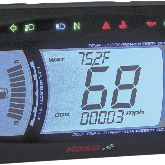 Caracteristicas: The XR-SR multi-function meter was designed especially for motorcycles and ATV’s Its digital screen will provide important information on your engine Easy-to-read, blue back-lit digital display with eight indicator lights The 8 indicator lights can be adapted to all motorcycles and ATV’s Display shows speed (mph/km/h), odometer, two trip meters, tach (100 rpm resolution), fuel level (10-bar display) and engine temperature Adjusts to any engine or tire size Keeps record of top speed, max rpm and max temperature Indicator lights for neutral, high beam, low beam, hazard lights, turn signals, oil pressure and water temperature Gauge measures 72.4mm (2.85") H x 116.3mm (4.57") W x 32.3mm (1.25") D Includes gauge bracket, speed sensor with bracket, speed sensor magnet and water temperature sensor (requires water temperature sensor adapter; sold separately)