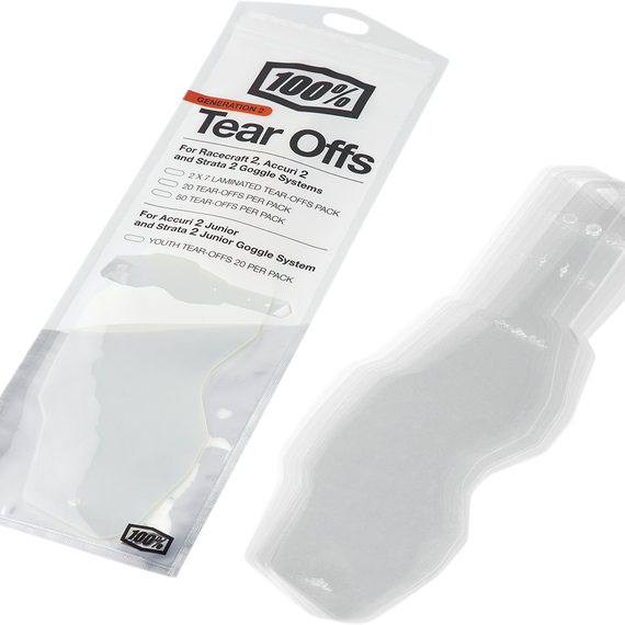 • Direct replacement tear-offs for 100% Youth Accuri 2 and Youth Strata 2 goggles